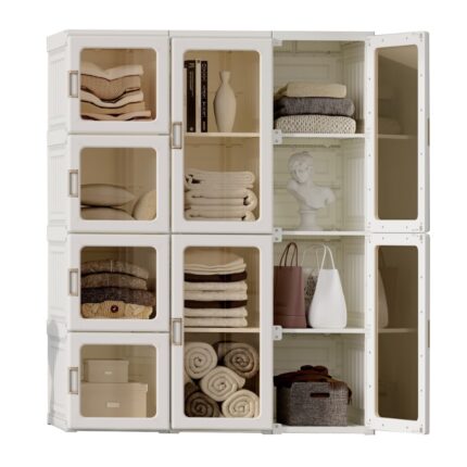 The wardrobe is made of PP and ABS material, giving it a durable and long-lasting finish. It has 9 cubes for storage space, with 6 doors that include magnet door catches to ensure everything stays securely closed. The doors also feature white finishes, making the wardrobe look stylish and modern in any decor. Additionally, there is one hanger included for hanging clothes or accessories. All this comes together to make a practical and stylish wardrobe that is perfect for any room in your home.